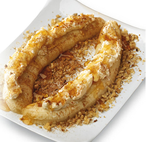 Peel two bananas and vertically cut into two. Place onto a shallow dish, place 50 gr. of clotted milk cream in slices on each banana half. Pour two tablespoons of honey onto the bananas. Powder a spoon of cinnamon. Ground walnuts can be added up to taste.